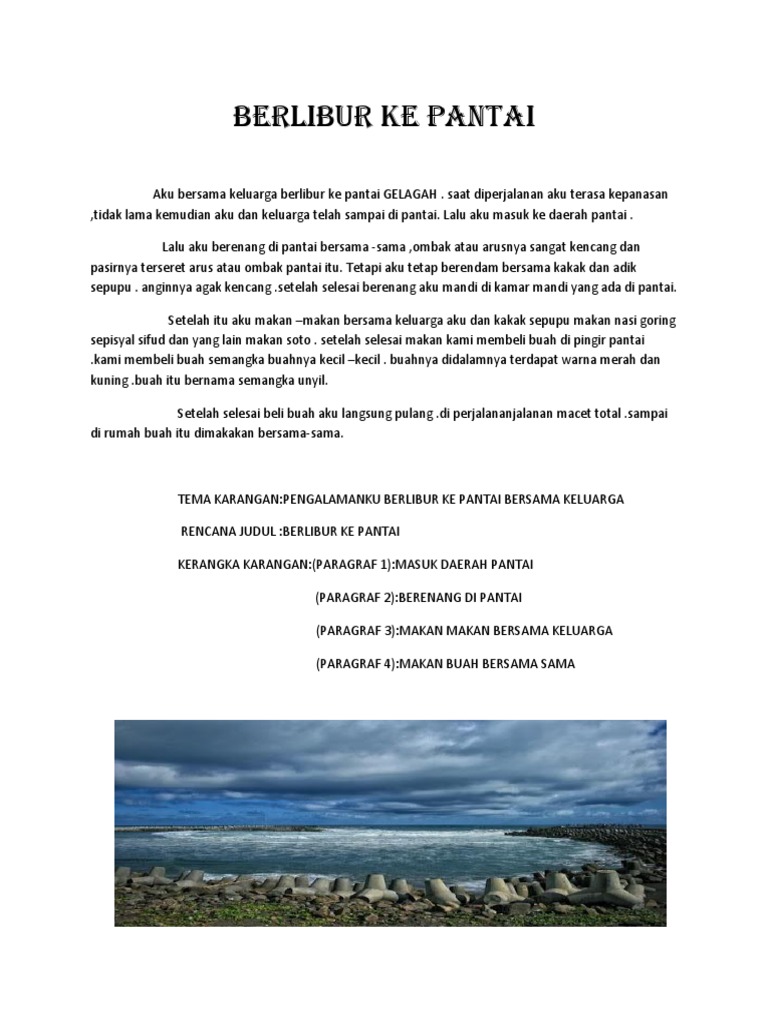 Berlibur Ke Pantai Pdf from imgv2-1-f.scribdassets.com Kumpulan contoh karangan artikel bahasa sunda tentang kesehatan singkat, 3 palagraf dan 4 palagraf tentang pentingnya menjaga kebersihan lingkungan contoh artikel karangan persuasi tema kesehatan bahasa sunda (3 paragraf). Contoh contoh karangan yang ini adalah tipe karangan sederhana tentang liburan di sebuah pantai di indonesia. Hari minggu ini adalah hari yang paling melelahkan bagiku. Ajukan pertanyaan tentang tugas sekolahmu. Kami pun segera menuju hotel dan merencanakan perjalanan liburan selama seminggu. Contoh karangan pada postingan ini hanya sekedar inspirasi bagi anda untuk membuat contoh teks eksplanasi sendiri. Contoh karangan narasi tentang pengalaman pribadi singkat narasi merupakan sebuah karangan yang mengisahkan atau menerangkan dengan rinci dan. Contoh paragraf narasi tentang bencana alam.